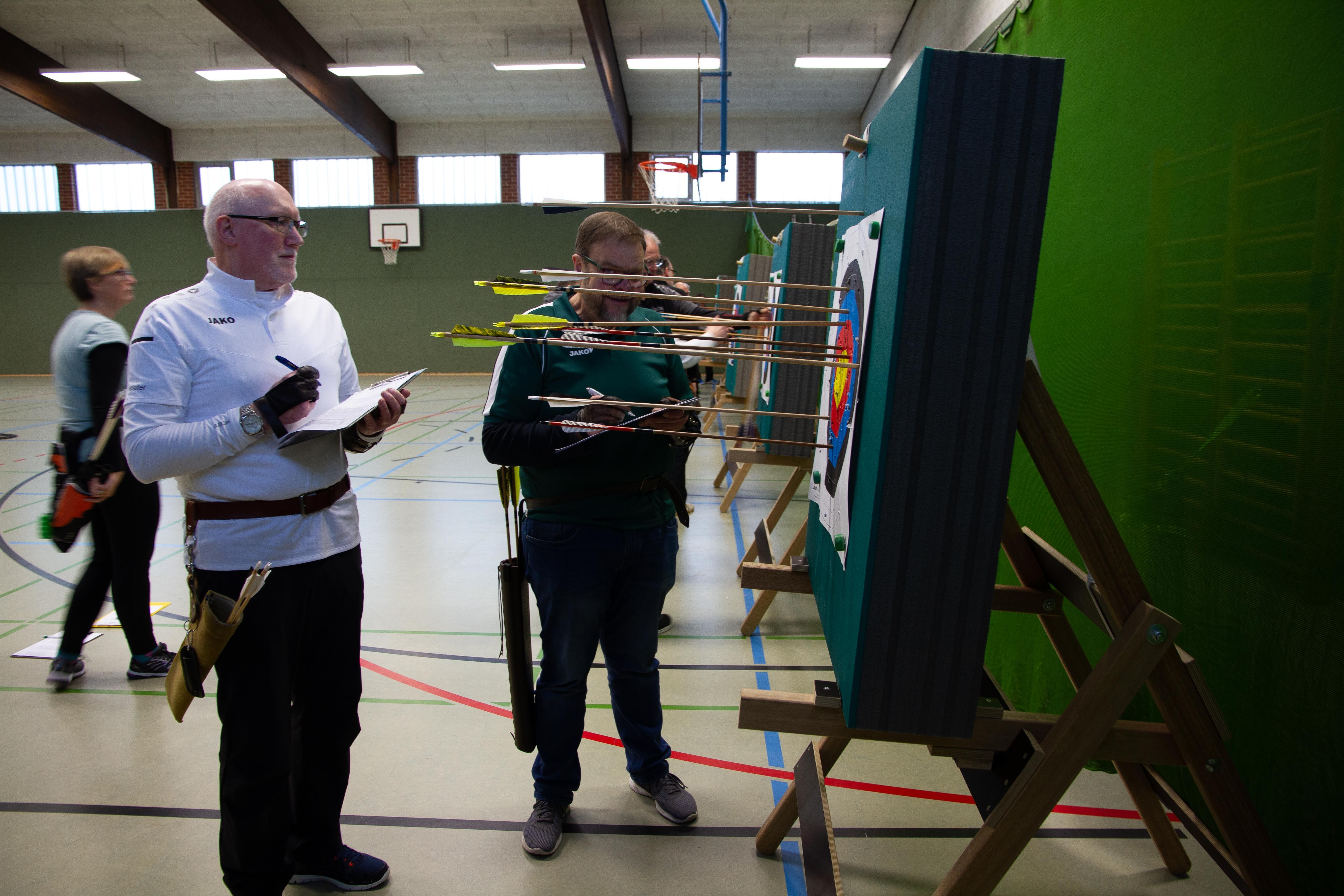 Den ersten Platz sicherte sich zu seiner eigenen Überraschung Hubert Montag, der für dieses Turnier seinen geliebten Compound blank gegen einen geliehenen Holzbogen mit eigens für dieses Turnier gefertigten Holzpfeilen eintauschte. Eine Reise zurück zu den Wurzeln, da er als Holzbogner seine Schützenkarriere begann. Unter den wachsamen Augen von Irmgard Zimmermann wurde sein Tun oft und gern auf den Zuschauerplätzen kommentiert – durchaus respekt- und humorvoll! Robert Boßler vom BSC Sennestadt (sonst eher mit glasbelegtem oder Jagdbogen am Start) bemerkte fasziniert, wie viele unterschiedliche Schießtechniken außerhalb der „Lehrmeinung“ zu beachtlichen Erfolgen führen können. So gab es mancherlei Erkenntnis, welche das Thema Bogenschießen in der eigenen Vorstellung bereichern konnte.